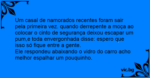 Um casal de namorados recentes foram sair pela primeira vez. quando derrepente a moça ao colocar o cinto de segurança deixou escapar um pum,e toda envergonhada disse: espero que isso só fique entre a gente.