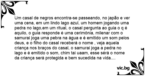 Um casal de negros encontra-se passeando, no japão e ver uma cena, em um lindo lago azul, um homem jogando uma pedra no lago,em um ritual, o casal pergunta ao guia o q é aquilo, o guia responde é uma cerimônia, milenar com o samurai joga uma pebra na àgua e é emitido um som pelos deus, e o filho do casal receberá o nome , veja aquela criança nos braços do casal, o samurai joga a pedra no lago e é emitido o som, chim tai uaam, esse sérá o nome da criança será protegida e bem sucedida na vida. o casal nеgrо diz também querer fazer este ritual quando tiver um filho, depois de um anos o casal de negros voltam ao local, pagam uma quantia exorbitante, o samurai fiса oposto, o casal de negros com o filho nos braços atentos para ver o som, o samurai joga a pedrinha no lago, onde ouve-se o som chim pam zé,