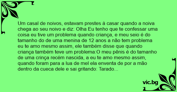 Um casal de noivos, estavam prestes à casar quando a noiva chega ao seu noivo e diz: Olha Eu tenho que te confessar uma coisa eu tive um problema quando criança, e meu seio é do tamanho do de uma menina de 12 anos a não tem problema eu te amo mesmo assim, ele também disse que quando criança também teve um problema:O meu pênis é do tamanho de uma crinça recém nascida, a eu te amo mesmo assim, quando foram para a lua de mel ela enventa de por a mão dentro da cueca dele e sai gritando: Таrаdо 100vergonha você não disse que seu pênis era do tamanho de uma criança recém nascida?Então:pesa 3kilos e mede 48 centimetros
