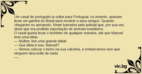 Um casal de português ia voltar para Portugual, no entanto, queriam levar um gambá do Brasil para mostrar a seus amigos. Quando chegaram no aeroporto, foram barrados pelo policial que, por sua vez, disse que era proibido exportação de animais brasileiros.