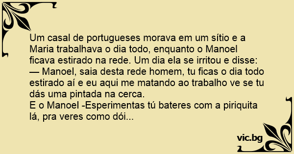 Um casal de portugueses morava em um sítio e a Maria trabalhava o dia todo, enquanto o Manoel ficava estirado na rede. Um dia ela se irritou e disse: