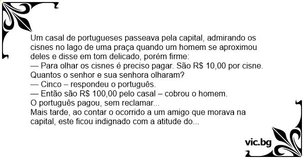 Um casal de portugueses passeava pela capital, admirando os cisnes no lago de uma praça quando um homem se aproximou deles e disse em tom delicado, porém firme:
