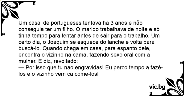 Um casal de portugueses tentava há 3 anos e não conseguia ter um filho. O marido trabalhava de noite e só tinha tempo para tentar antes de sair para o trabalho. Um certo dia, o Joaquim se esquece do lanche e volta para buscá-lo. Quando chega em casa, para espanto dele, encontra o vizinho na cama, fazendo sеxо оrаl com a mulher. E diz, revoltado: