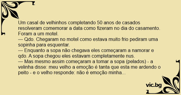— Mas mesmo assim começaram a tomar a sopa (pelados) - a velinha disse: meu velho a emoção é tanta que esta me ardendo o peito - e o velho responde: não é emoção minha velha e que você esta com as tetas dentro da sopa..............