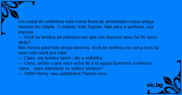 Um casal de velhinhos está numa festa de aniversário numa antiga taverna da cidade. O marido, todo fogoso, fala para a senhora, sua esposa: