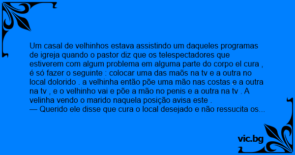 Um casal de velhinhos estava assistindo um daqueles programas de igreja quando o pastor diz que os telespectadores que estiverem com algum problema em alguma parte do corpo el cura , é só fazer o seguinte : colocar uma das maõs na tv e a outra no local dolorido . a velhinha então põe uma mão nas costas e a outra na tv , e o velhinho vai e põe a mão no реnis e a outra na tv . A velinha vendo o marido naquela posição avisa este .