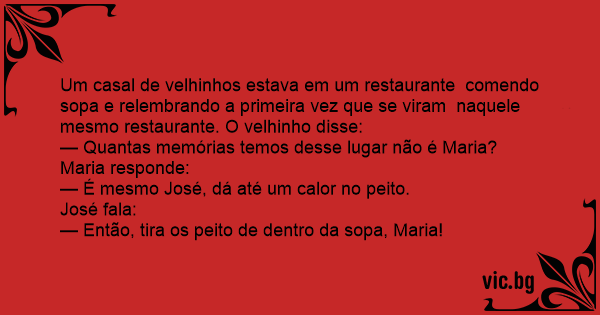 Um casal de velhotes resolveu ir comer ao mesmo hotel e dormir no mesmo quarto onde tinham passado a noite de núpcias para festejar os 50 anos de casados. No meio da refeição diz a velha: — Ai...