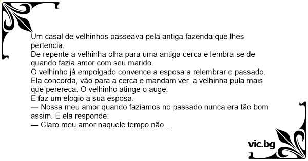 O velhinho já empolgado convence a esposa a relembrar o passado. Ela concorda, vão para a cerca e mandam ver, a velhinha pula mais que perereca. O velhinho atinge o auge.