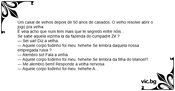 Um casal de velhos depois de 50 anos de casados. O velho resolve abrir o jogo pra velha: