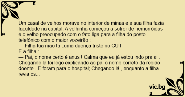 Um casal de velhos morava no interior de minas e a sua filha fazia faculdade na capital. A velhinha começou a sofrer de hemorróidas e o velho preocupado com o fato liga para a filha do posto telefônico com o maior vozeirão :