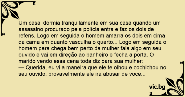 Um casal dormia tranquilamente em sua casa quando um assassino procurado pela polícia entra e faz os dois de refens. Logo em seguida o homem amarra os dois em cima da cama em quanto vasculha o quarto... Logo em seguida o homem para chega bem perto da mulher fala algo em seu ouvido e vai em direção ao banheiro e fecha a porta. O marido vendo essa cena toda diz para sua mulher:
