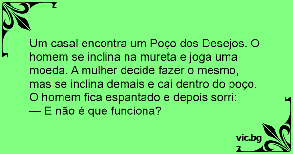 Un marido y su mujer están paseando por el bosque y descubren un pozo de los deseos. El marido lanza una moneda y pide un deseo... cuando la mujer se estaba acercando, de pronto se cae!... - Vaya que bien!!!... esto funciona - dice el marido.