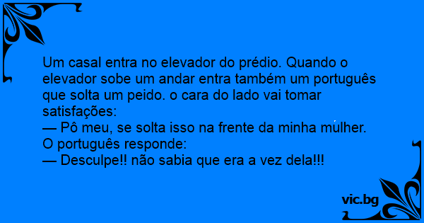 Um casal entra no elevador do prédio. Quando o elevador sobe um andar entra também um português que solta um реidо. o cara do lado vai tomar satisfações: