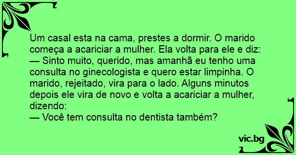 — Sinto muito, querido, mas amanhã eu tenho uma consulta no ginecologista e quero estar limpinha. O marido, rejeitado, vira para o lado. Alguns minutos depois ele vira de novo e volta a acariciar a mulher, dizendo: