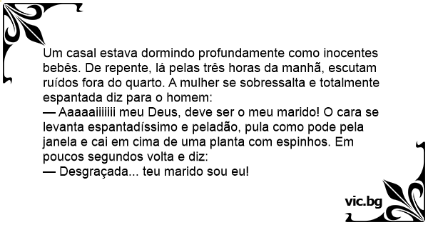 — Aaaaaiiiiiii meu Deus, deve ser o meu marido! O cara se levanta espantadíssimo e peladão, pula como pode pela janela e cai em cima de uma planta com espinhos. Em poucos segundos volta e diz:
