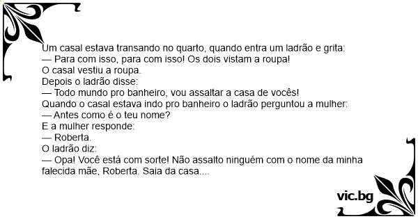 — Opa! Você está com sorte! Não assalto ninguém com o nome da minha falecida mãe, Roberta. Saia da casa.
