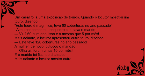Um casal foi a uma exposição de touros. Quando o locutor mostrou um touro, dizendo: