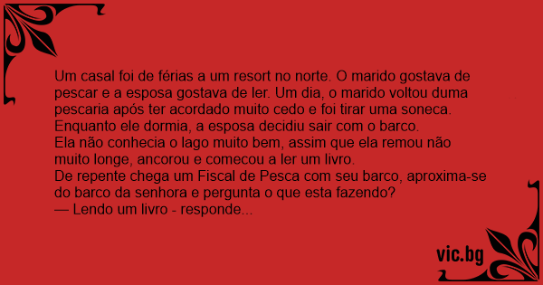 Um casal foi de férias a um resort no norte. O marido gostava de pescar e a esposa gostava de ler. Um dia, o marido voltou duma pescaria após ter acordado muito cedo e foi tirar uma soneca.