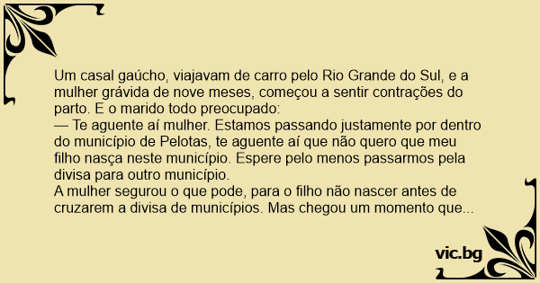 Um casal gaúcho, viajavam de carro pelo Rio Grande do Sul, e a mulher grávida de nove meses, começou a sentir contrações do parto. E o marido todo preocupado:
