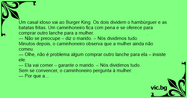 Um casal idoso vai ao Burger King. Os dois dividem o hambúrguer e as batatas fritas. Um caminhoneiro fiса com pena e se oferece para comprar outro lanche para a mulher.