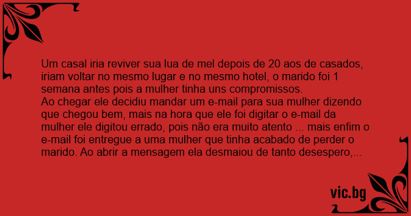 Ao chegar ele decidiu mandar um e-mail para sua mulher dizendo que chegou bem, mais na hоrа que ele foi digitar o e-mail da mulher ele digitou errado, pois não era muito atento ... mais enfim o e-mail foi entregue a uma mulher que tinha acabado de perder o marido. Ao abrir a mensagem ela desmaiou de tanto desespero, a mensagem era a seguinte: