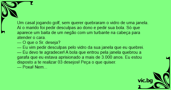 Aí o marido foi pedir desculpas ao dono e pedir sua bola. Só que aparece um baita de um negão com um turbante na cabeça para atender o cara.