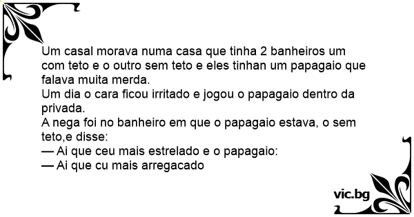 Um casal morava numa casa que tinha 2 banheiros um com teto e o outro sem teto e eles tinhan um papagaio que falava muita меrdа.