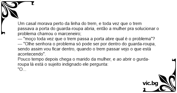 Um casal morava perto da linha do trem, e toda vez que o trem passava a porta do guarda-roupa abria, então a mulher pra solucionar o problema chamou o marceneiro;