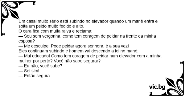 — Mal educado! Como tem coragem de peidar num elevador com a minha mulher por perto? Você não sabe segurar?