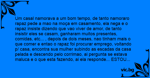 Um casal namorava a um bom tempo, de tanto namoraro rapaz pede a mao na moça em casamento, ela nega e o rapaz insiste dizendo que vao viver de amor, de tanto insistir eles se casam, ganharam muitos presentes, comidas, etc... , depois de dois meses, nao tinham mais o que comer e entao o rapaz foi procurar emprego, voltando p/ casa, encontra sua mulher subindo as escadas da casa pelada e descendo pelo corrimao, ai pergunta se estava maluca e o que esta fazendo, ai ela responde... ESTOU ESQUENTANDO A SUA JANTA.