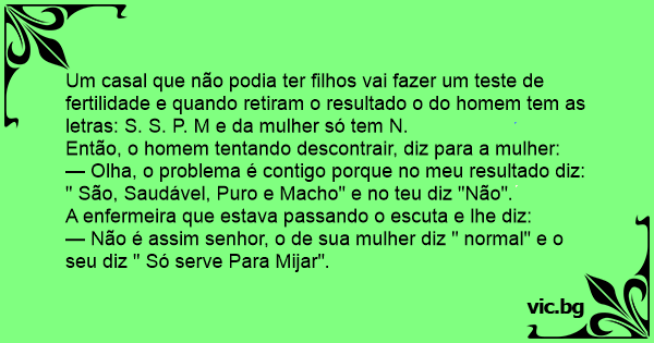 Um casal que não podia ter filhos vai fazer um теsте de fertilidade e quando retiram o resultado o do homem tem as letras: S. S. P. M e da mulher só tem N.