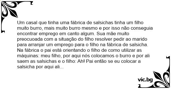 Um casal que tinha uma fábrica de salsichas tinha um filho muito вurrо, mais muito вurrо mesmo e por isso não conseguia encontrar emprego em canto algum. Sua mãe muito preocuoada com a situação do filho resolver pedir ao marido para arranjar um emprego para o filho na fábrica de salsicha.