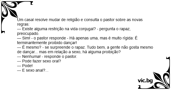 — Sim! - o pastor responde - Há apenas uma, mas é muito rígida: É terminantemente proibido dançar!