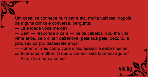 Um casal se conhece num bar e ela, muita vaidosa, depois de alguns drinks e conversa, pergunta: