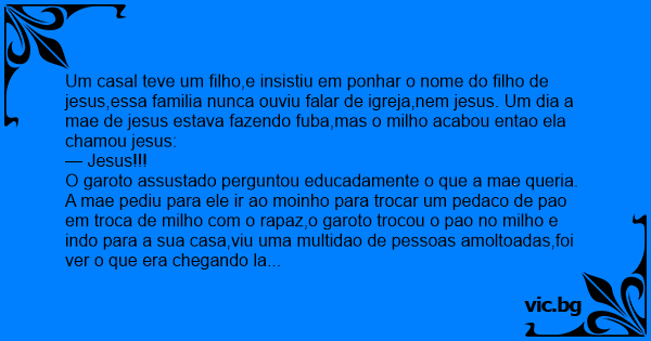 Um casal teve um filho,e insistiu em ponhar o nome do filho de jesus,essa familia nunca ouviu falar de igreja,nem jesus. Um dia a mae de jesus estava fazendo fuba,mas o milho acabou entao ela chamou jesus: