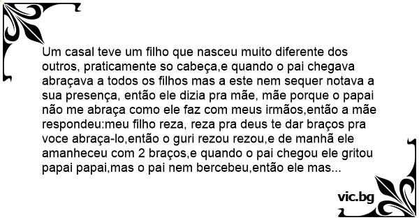 Um casal teve um filho que nasceu muito diferente dos outros, praticamente so cabeça,e quando o pai chegava abraçava a todos os filhos mas a este nem sequer notava a sua presença, então ele dizia pra mãe, mãe porque o papai não me abraça como ele faz com meus irmãos,então a mãe respondeu:meu filho reza, reza pra deus te dar braços pra voce abraça-lo,então o guri rezou rezou,e de manhã ele amanheceu com 2 braços,e quando o pai chegou ele gritou papai papai,mas o pai nem bercebeu,então ele mas uma vez falou com a mãe,e a mãe aconselhou que ele rezasse mais e pedir pra deus lhe dar pernas, então ele rezou rezou e rezou e puf:de manhã ele amanheceu com 2 pernas,o garoto foi correndo pro quintal, em seguida o pai entra na casa e diz pra mulher: mulher tu não sabes o que foi que eu matei no jardim, ela disse não,e ele falou:uma enorme aranha-caranguejeira quase do meu tamanho,e eu passei com o trator por cima dela.