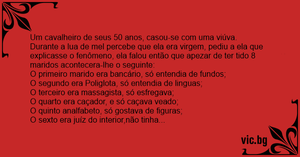 Durante a lua de mel percebe que ela era virgem, pediu a ela que explicasse o fenômeno, ela falou então que apezar de ter tido 8 maridos acontecera-lhe o seguinte: