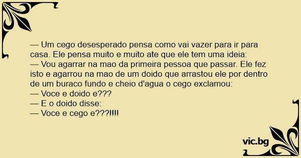 — Vou agarrar na mao da primeira pessoa que passar. Ele fez isto e agarrou na mao de um doido que arrastou ele por dentro de um buraco fundo e cheio d'agua o cego exclamou: