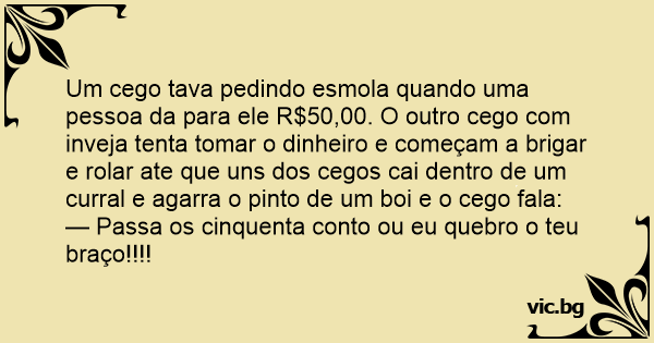 Um cego tava pedindo esmola quando uma pessoa da para ele R$50,00. O outro cego com inveja tenta tomar o dinheiro e começam a brigar e rolar ate que uns dos cegos cai dentro de um curral e agarra o pinto de um boi e o cego fala: