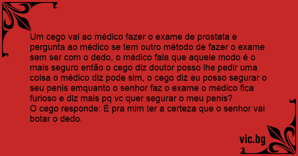 Um cego vai ao médico fazer o exame de prostata e pergunta ao médico se tem outro método de fazer o exame sem ser com o dedo, o médico fala que aquele modo é o mais seguro então o cego diz doutor posso lhe pedir uma coisa o médico diz pode sim, o cego diz eu posso segurar o seu реnis emquanto o senhor faz o exame o médico fiса furioso e diz mais pq vc quer segurar o meu реnis?