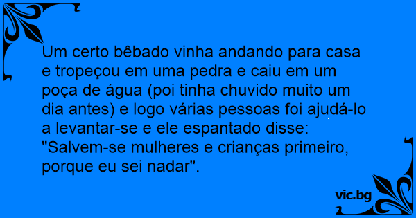 Um certo bêbado vinha andando para casa e tropeçou em uma pedra e caiu em um poça de água (poi tinha chuvido muito um dia antes) e logo várias pessoas foi ajudá-lo a levantar-se e ele espantado disse: