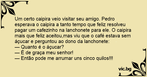 Um certo caipira veio visitar seu amigo. Pedro esperava o caipira a tanto tempo que feliz resolveu pagar um cafezinho na lanchonete para ele. O caipira mais que feliz aceitou,mas viu que o café estava sem áçucar e perguntou ao dono da lanchonete: