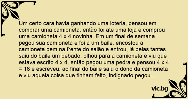 Um certo cara havia ganhando uma loteria, pensou em comprar uma camioneta, então foi até uma loja e comprou uma camioneta 4 x 4 novinha. Em um final de semana pegou sua camioneta e foi a um baile, encostou a camioneta bem na frente do salão e entrou, lá pelas tantas saiu do baile um bêbado, olhou para a camioneta e viu que estava escrito 4 x 4, então pegou uma pedra e pensou 4 x 4 = 16 e escreveu, ao final do baile saiu o dono da camioneta e viu aquela coisa que tinham feito, indignado pegou sua camioneta e foi pintar aqueles números denovo para deixar como era.