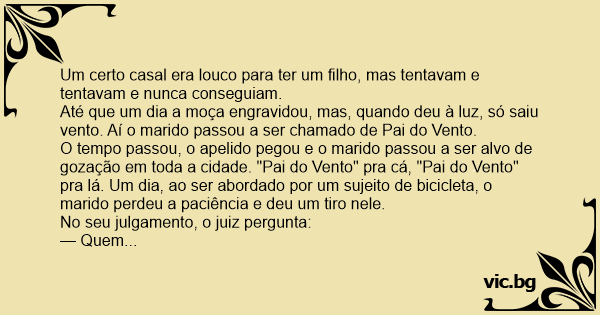 O tempo passou, o apelido pegou e o marido passou a ser alvo de gozação em toda a cidade. "Pai do Vento" pra cá, "Pai do Vento" pra lá. Um dia, ao ser abordado por um sujeito de bicicleta, o marido perdeu a paciência e deu um tiro nele.