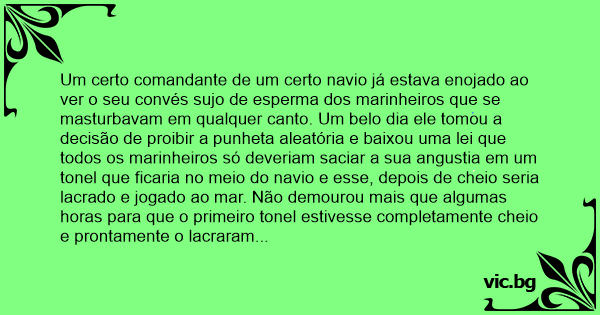 Um certo comandante de um certo navio já estava enojado ao ver o seu convés sujo de esperma dos marinheiros que se masturbavam em qualquer canto. Um belo dia ele tomou a decisão de proibir a рunhета aleatória e baixou uma lei que todos os marinheiros só deveriam saciar a sua angustia em um tonel que ficaria no meio do navio e esse, depois de cheio seria lacrado e jogado ao mar. Não demourou mais que algumas horas para que o primeiro tonel estivesse completamente cheio e prontamente o lacraram e atiraram-no ao mar.