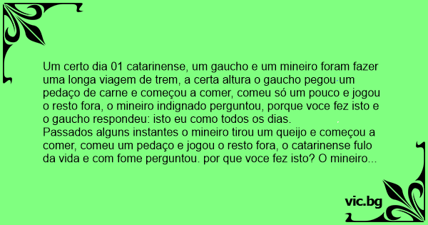 Um certo dia 01 catarinense, um gaucho e um mineiro foram fazer uma longa viagem de trem, a certa altura o gaucho pegou um pedaço de carne e começou a comer, comeu só um pouco e jogou o resto fora, o mineiro indignado perguntou, porque voce fez isto e o gaucho respondeu: isto eu como todos os dias.