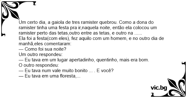 Um certo dia, a gaiola de tres ramister quebrou. Como a dona do ramister tinha uma festa pra ir,naquela noite, então ela colocou um ramister perto das tetas,outro entre as tetas, e outro na ......
