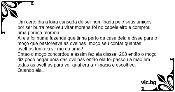 Um certo dia a loira cansada de ser humilhada pelo seus amigos por ser burra resolveu virar morena foi no cabeleleiro e comprou uma peruca morena .