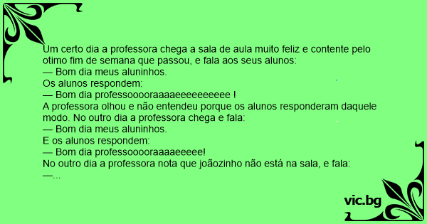 Um certo dia a professora chega a sala de aula muito feliz e contente pelo otimo fim de semana que passou, e fala aos seus alunos: — Bom dia meus aluninhos. Os alunos respondem: — Bom dia professooooraaaaeeeeeeeeee ! A professora olhou e não entendeu porque os alunos responderam daquele modo. No outro dia a professora chega e fala: — Bom dia meus aluninhos. E os alunos respondem: — Bom dia professooooraaaaeeeee! No outro dia a professora nota que joãozinho não está na sala, e fala: — Bom dia meus aluninhos. E os alunos respondem: — Bom dia professooooraaaaaa! A professora fiса admirada do porque que dessa vez eles responderam direito. Então ela conbinou com os outros alunos que quando joãozinho chegasse e a professora entrasse e desse bom dia , ninguem responderia só joãozinho. Então no outro a professora chega com muita pressa , entra na sala e diz: — Bom dia meus aluninhos. Ai então todos os outros alunos ficaram quietos e joãozinho respondeu: — Vai se Fudeeeeeeeeee !