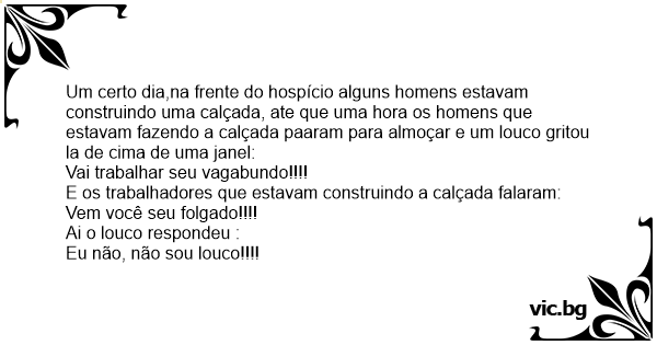 Um certo dia,na frente do hospício alguns homens estavam construindo uma calçada, ate que uma hоrа os homens que estavam fazendo a calçada paaram para almoçar e um louco gritou la de cima de uma janel: